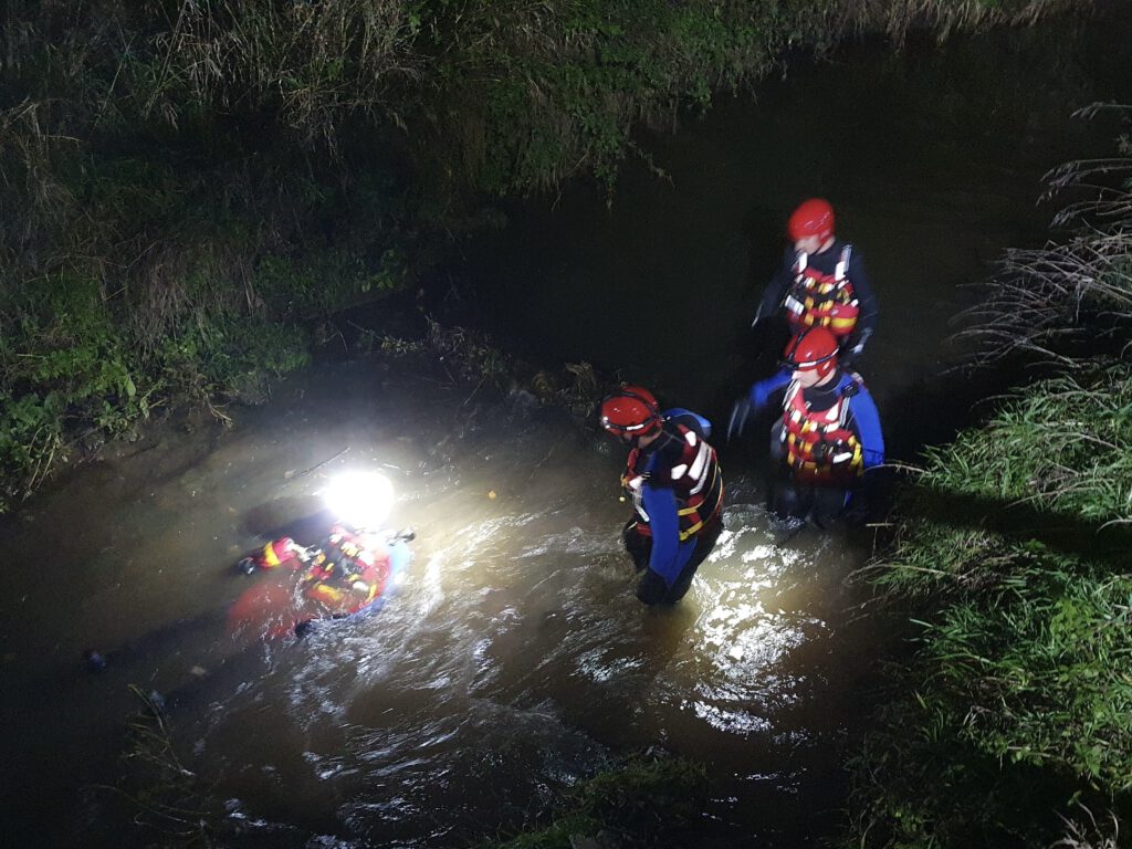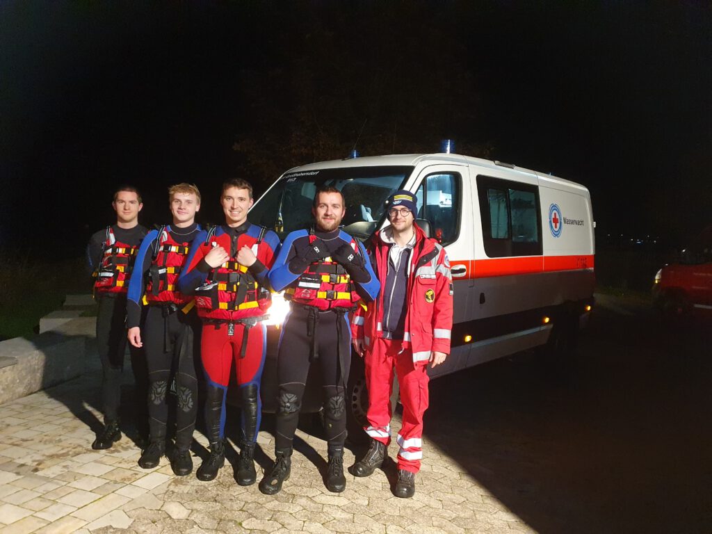 Das Szenario war ein verunglückter Traktor, der gegen eine Brücke gekracht war. Zwei der drei beteiligten Personen wurden im Bereich des Gewässers vermisst. Für unsere Truppe hieß es damit eine Vermisstensuche im und am Gewässer einzuleiten. Die Suche war erfolgreich und wir haben die verunfallten Personen aus dem Gefahrenbereich bringen können.