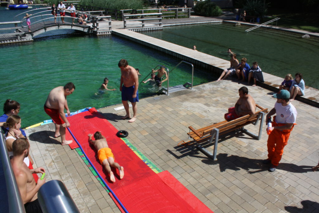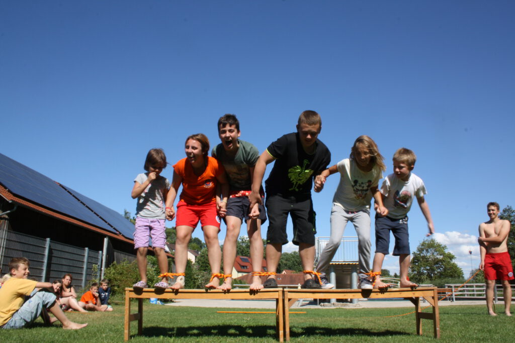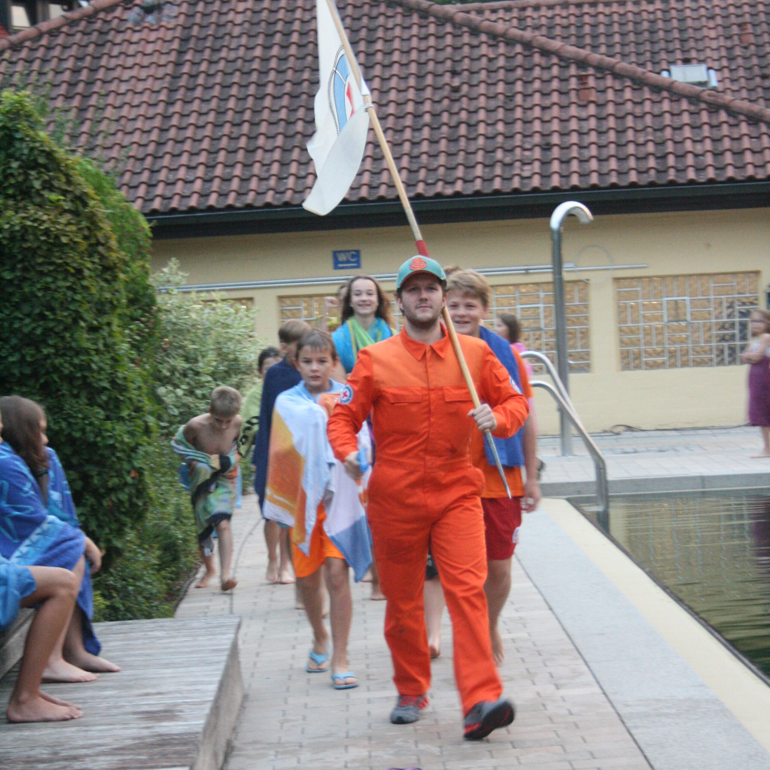 Angefangen hat alles wie gewohnt, Freitagabend gegen 18 Uhr konnten die knapp 40 Kinder und Jugendlichen die Zelte beziehen. Als das Freibad um 19 Uhr schloss, luden wir zum gemeinsamen Grillen mit den Eltern ein. Samstag früh um 5 Uhr folgte dann der Weckruf: Blaues Blinklicht und die Titelmusik zu Takeshi´s Castle gefolgt von Marschmusik läutete den Beginn der anstehenden Aufgaben des Tages ein. Einige, noch immer ungläubig, dass wir den angedrohten Weckruf tatsächlich in die Tat umgesetzt haben, schafften es erst nach 10 Minuten aus dem Bett zu kriechen. Eine kurze Begrüßung durch den General, welcher die Gruppe durch die anstehenden Aufgaben delegierte, motivierte alle und so zogen sie mit wehenden Fahnen zum Schwimmerbecken, wo eine äußerst wackelige Überquerung des Beckens, als erste Aufgabe, auf sie wartete. Nachdem diese Aufgabe bewältigt war, wurde gefrühstückt.